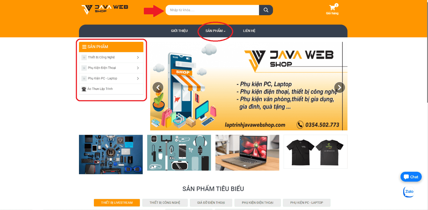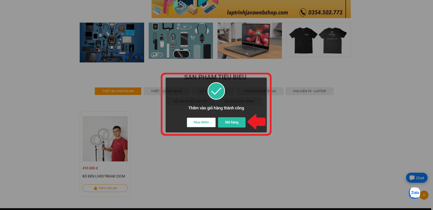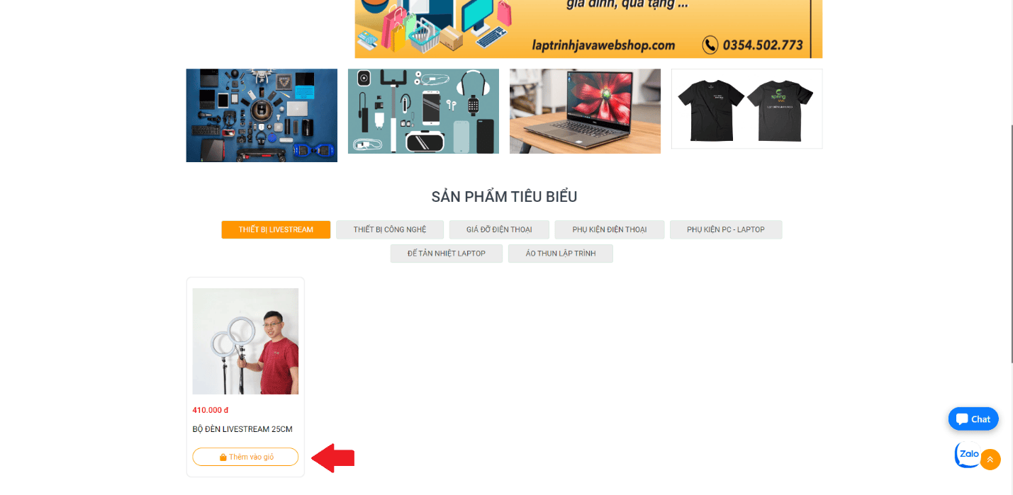 Khi vào trang chủ của laptrinhjavaweb shop, quý khách có thể chọn mục Sản phẩm hoặc nhập từ khóa để tìm kiếm để chọn sản phẩm phù hợp. Tiếp đó, quý khách chỉ cần nhấn chọn Thêm vào giỏ như hình dưới đây