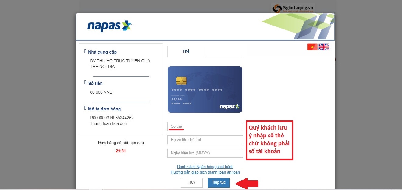 + Bước tiếp theo, quý khách cần nhập các thông tin (số thẻ, họ tên...). Khi đã nhập xong, quý khách nhấn Tiếp tục