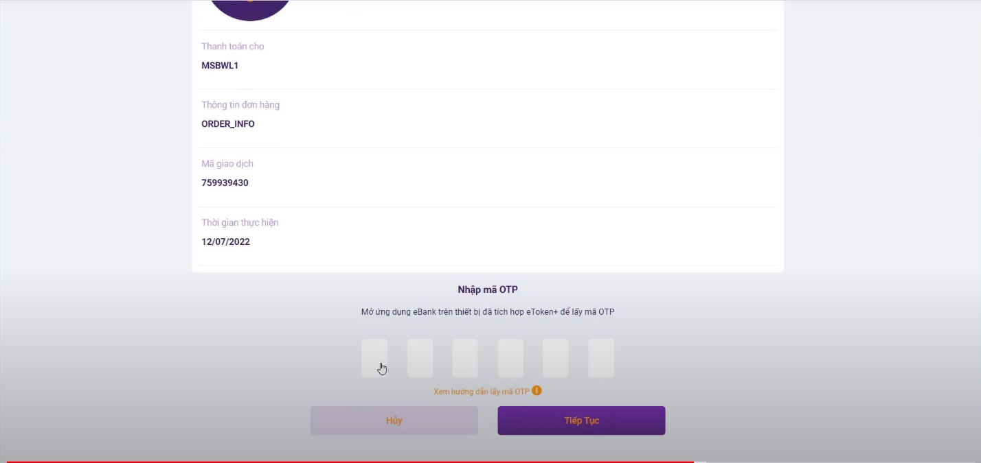 + Quý khách nhập mã OPT xong bấm Tiếp tục và chờ hệ thống báo Thanh toán thành công như hình.