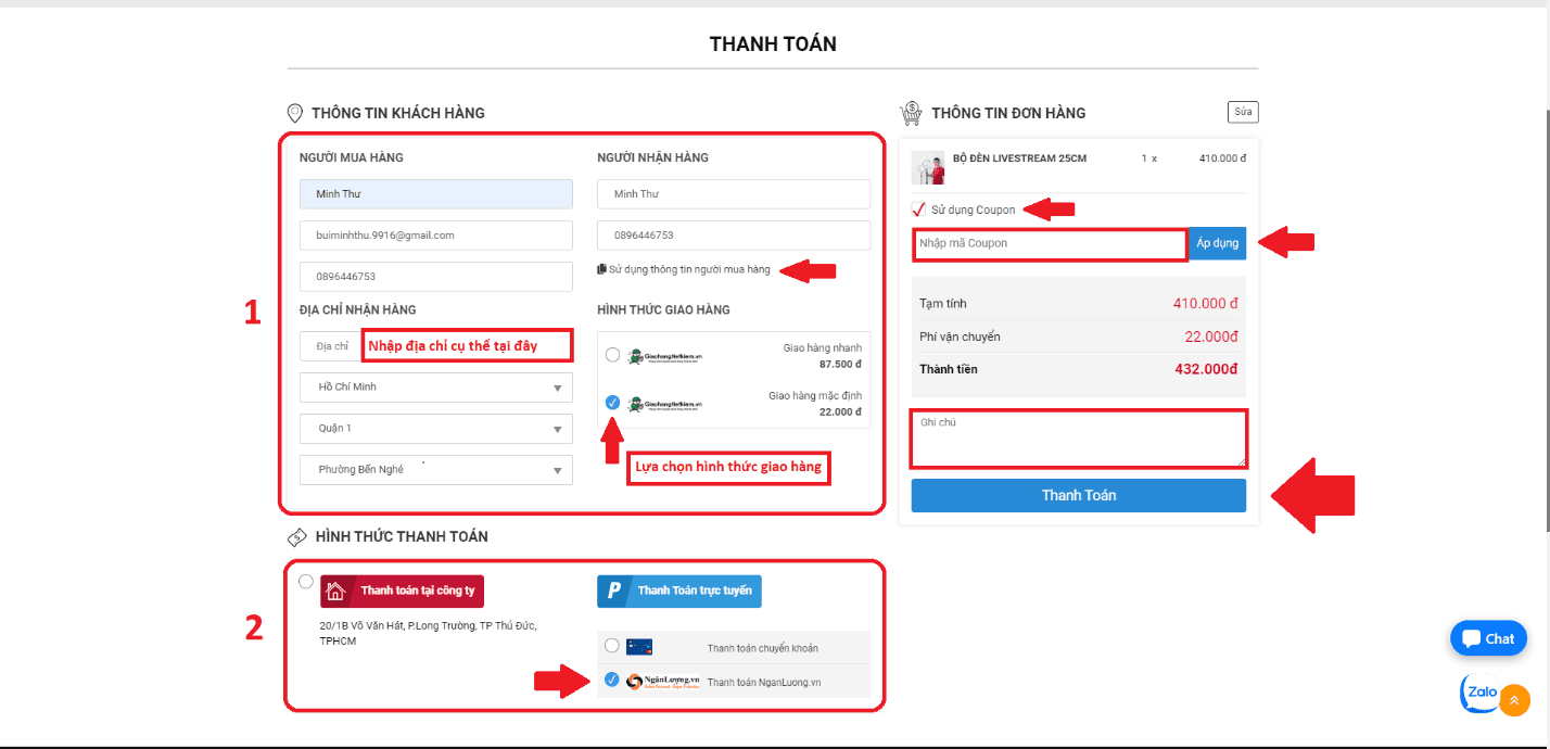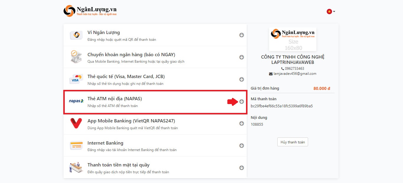 Sau đây là ví dụ về hình thức Thanh toán online (Thanh toán NganLuong.vn) ở trong nước
