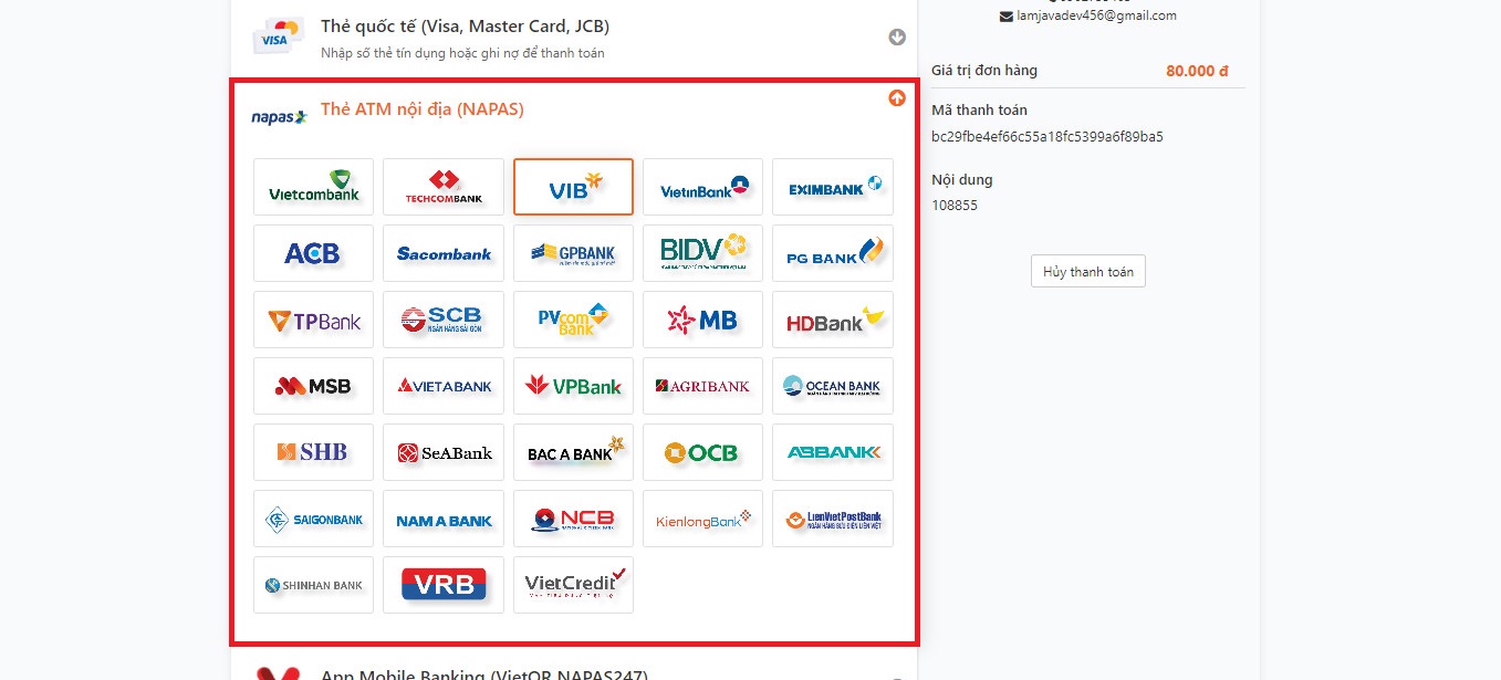 + Chọn Thẻ ATM nội địa (NAPAS). Sau đó chọn ngân hàng để thanh toán.