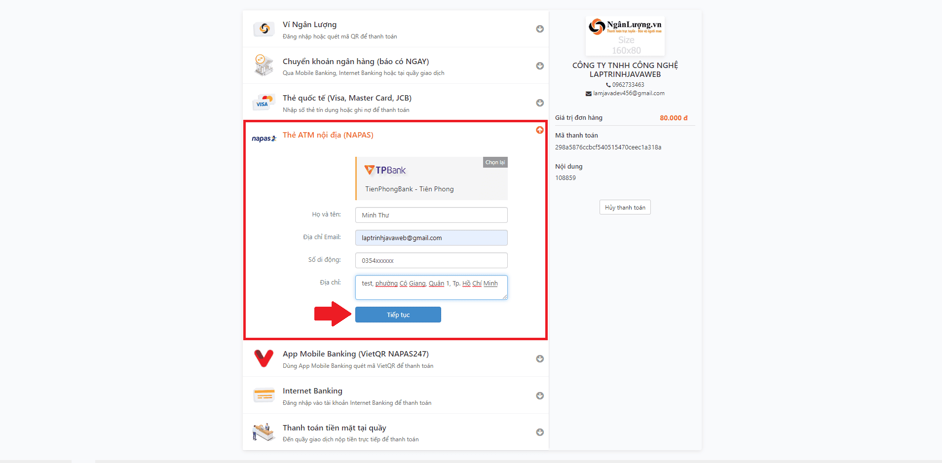 Dưới đây là ví dụ về thanh toán bằng tài khoản ngân hàng TPBank (Ngân hàng Tiên Phong)